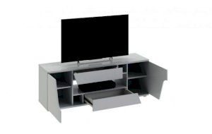 Тумба ТВ оснащена открытой нишей для техники, выдвижными ящиками, закрытыми секциями и широкой поверхностью подставки под телевизор. Отличительной чертой тумбы является отсутствие лицевой фурнитуры, что позволяет открывать ее с помощью захвата фасада рукой.