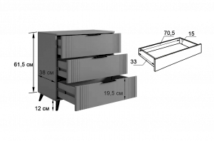 Комод изготовлен из качественных материалов: корпус выполнен из ЛДСП, что гарантирует прочность и долговечность, а фасад, выполненный из МДФ в плёнке ПВХ, не только выглядит эстетично, но и защищает комод от повреждений. Особое внимание заслуживает фрезеровка фасадов, которая придаёт изделию изысканный вид.